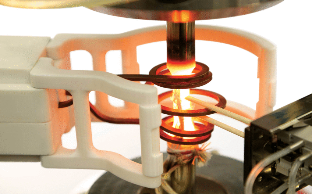 Indukční spirály jsou speciálním příslušenstvím pro statické i únavové stroje, které umožňuje mechanické zkoušky přímo během rychlého a lokálního ohřevu vzorku. Tento princip indukčního ohřevu umožňuje dosáhnout teplot až kolem +1500 °C s velmi rychlými náběhy i přesným řízením teplotního profilu. V kombinaci s chlazením se spirály využívají při testech TMF (Thermo-Mechanical Fatigue), kde se vzorek cyklicky zatěžuje jak mechanicky, tak teplotně. Tento typ zkoušek je zásadní například pro turbínové lopatky, výfukové systémy nebo vysoce namáhané součásti motorů. Normativní rámec zahrnuje např. ASTM E606/E606M (nízkocyklová únava), ISO 12111 (TMF zkoušky kovů) nebo ASTM E2368 (definice teplotně-mechanických cyklů). Indukční spirály tak umožňují co nejvěrněji simulovat extrémní provozní podmínky a přinášejí data nezbytná pro návrh životnosti a spolehlivosti kritických komponent.